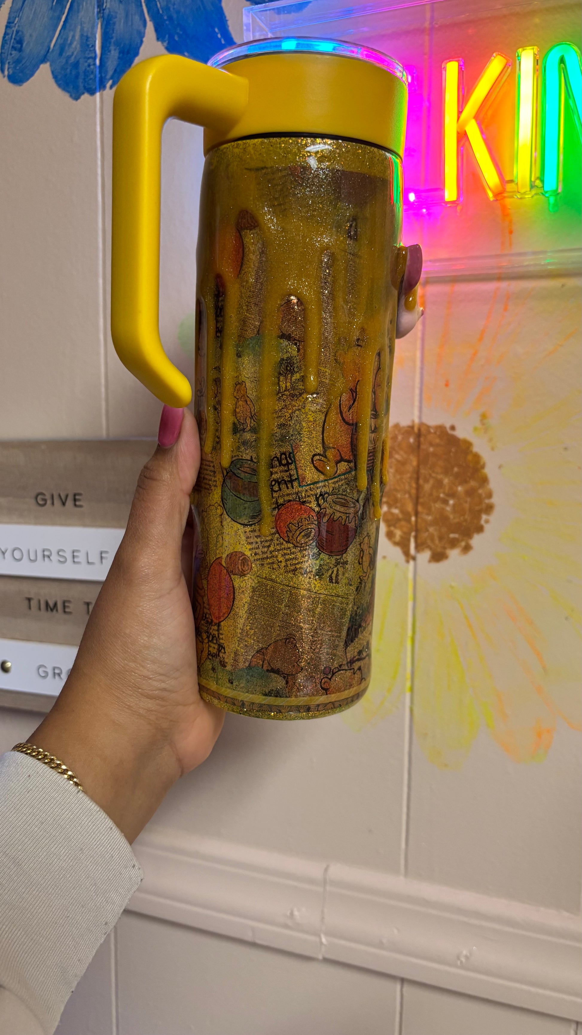 Nuestro Skinny Tumbler de 20 onzas con asa y tapa removibles es perfecto para quienes aman los detalles únicos y llenos de ternura. Este diseño inspirado en Winnie the Pooh, Piglet y Eeyore está decorado con efecto “honey drip” y glitter dorado que lo hace brillar en cada ángulo. Ideal para llevar tus bebidas favoritas con estilo, ya sea con asa, sin asa, con tapa o sin tapa… ¡tú decides cómo usarlo!